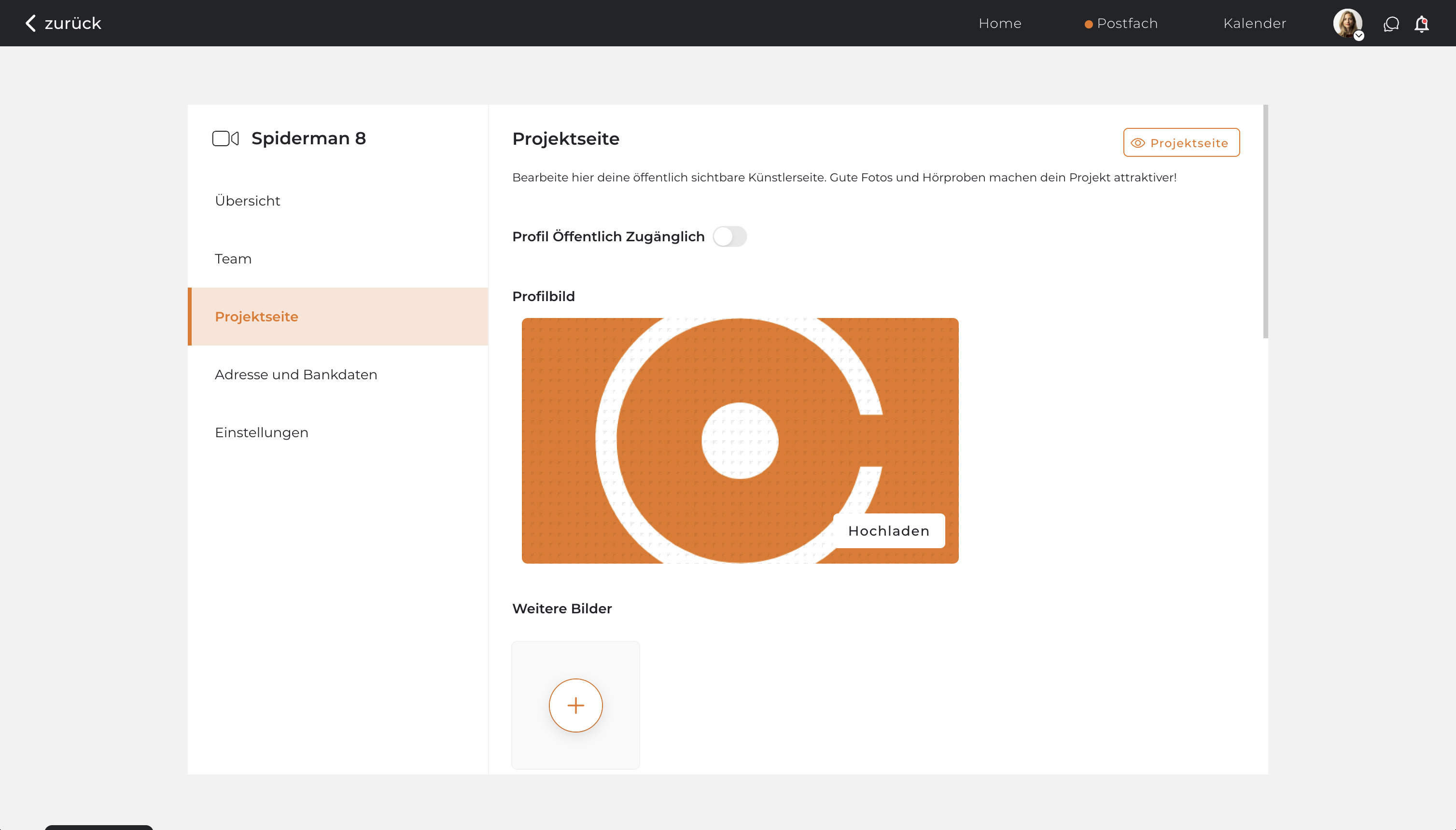 Unter dem Reiter Projektseite bearbeitest du das öffentliche Erscheinungsbild. Diese Seite ist deine Visitenkarte nach außen: für Sponsoren, Presse, Veranstalter oder potenzielle Auftraggeber.