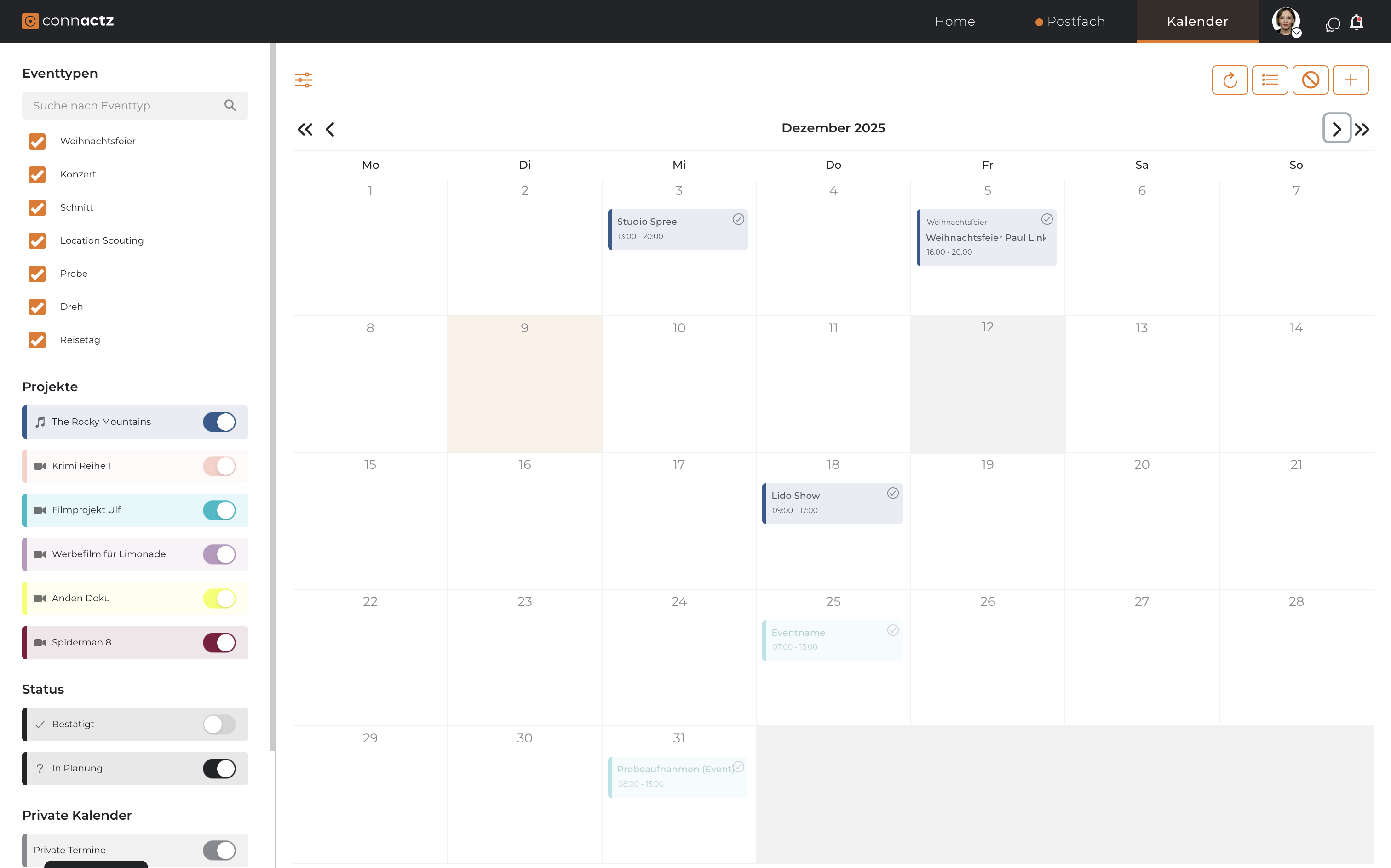 - Main area (Grid): Here you can see all events as colored blocks - Click on an event to see details or edit it - Use the arrows at the top left (< >) to switch between months - Sidebar (Links) - Your filters: Here you can control exactly what is displayed. This is especially important if you are managing many projects at the same time. - Event types: - For film projects: Tick what you want to see (e.g. only "Shoot" and "Travel day", but no "Meetings") - For music projects: Tick the event types you want to see (e.g. only "Concert" or "Christmas party") - Projects: Switch entire projects on or off. Each project has its own color (the small bar on the left of the event) so that you can immediately distinguish them in the calendar - Status: Filter by booking status. For example, show only "Confirmed" events and hide everything that is still "In planning" - Private calendars: If you have linked external calendars (Google/Outlook), you can show or hide them here - Toolbar (top right): - Refresh icon: Refreshes the view.