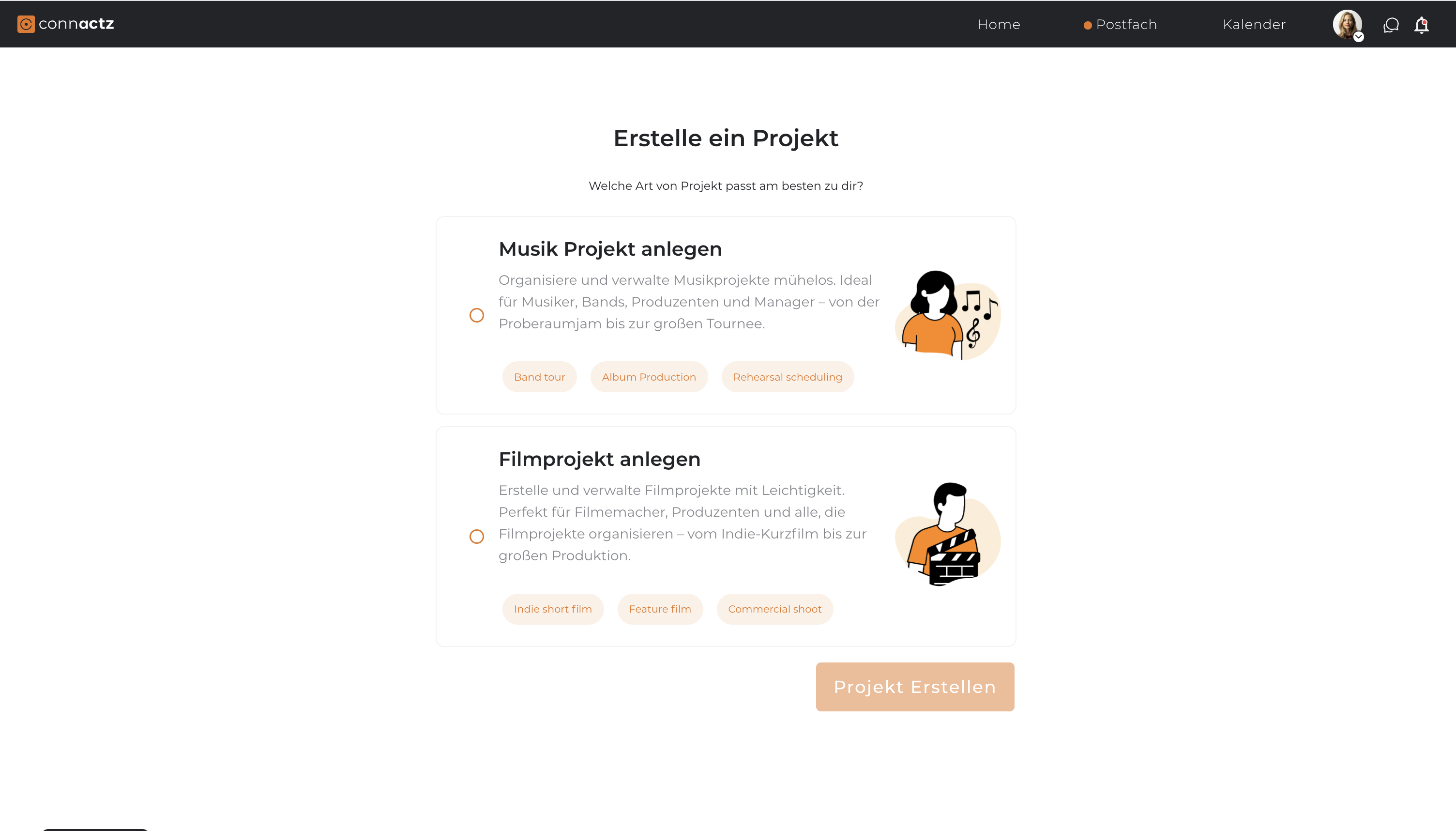 Create a new project: 1. click on your avatar in the top left corner. 2. click on Create new project 3. give the project a name. For film projects it is the name of the film, for music projects it is your band name / artist name. 4. enter the details. 1. For film project: Choose a genre and optionally add a description. 2. for music project: Choose genre, ** cast type and event types. You can then specify a home location.