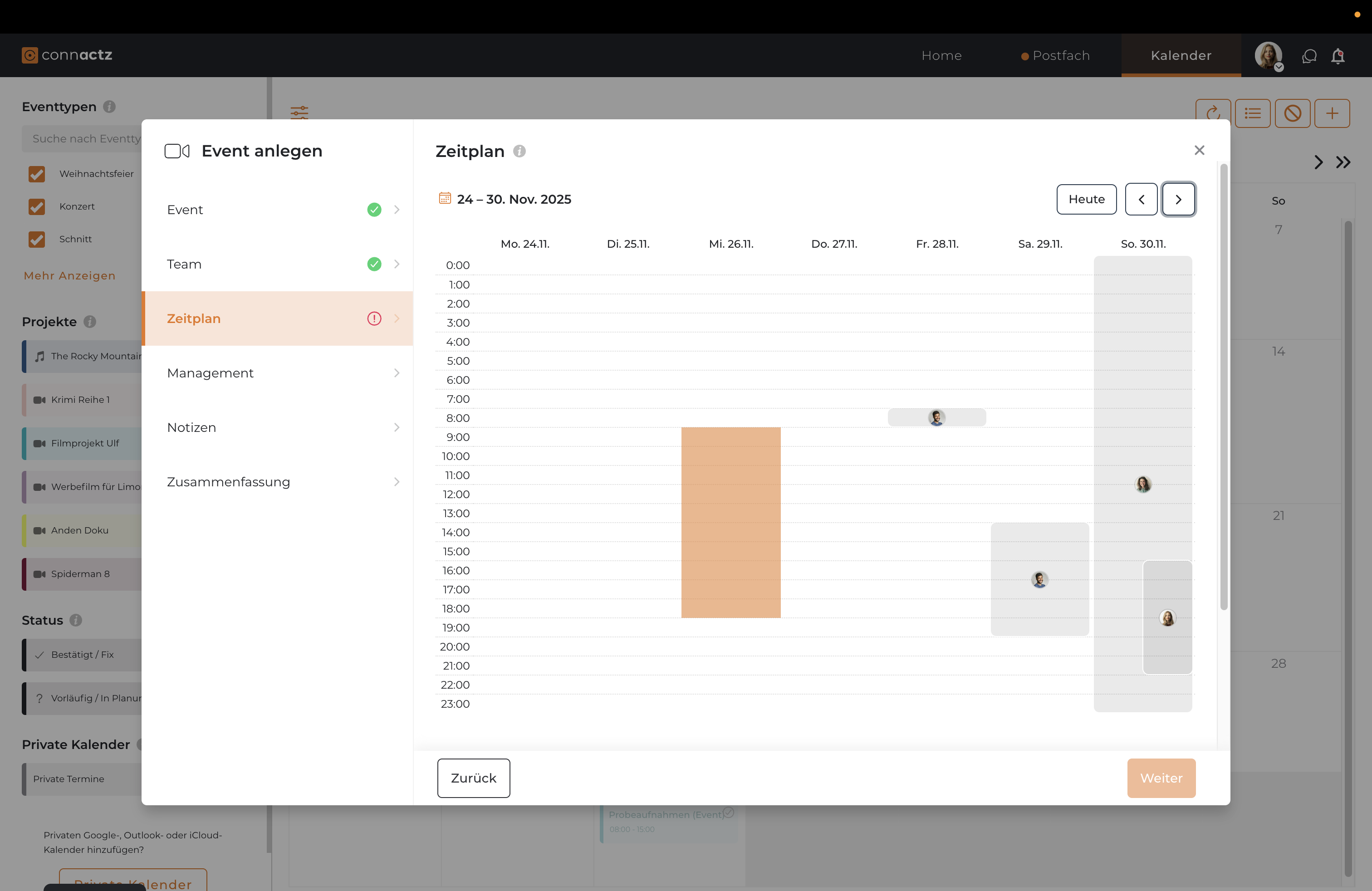 ## 2. Set time period (drag & drop) Find a gap in which your prioritized team members are available (no gray bars). 1. Drag time period: Click in the calendar and drag the desired time period with the mouse button pressed. 2. Adjust: You can move the colored bar afterwards or drag it longer/shorter at the edges. ## 3. Split event (splitting) You can divide an event into several blocks. 1. simply draw up a second or third period on the same day (or on subsequent days). 2. for each block you can optionally enter a separate name (e.g. "Setup", "Show") and a different location. ## 4. Finalize As soon as the schedule is set: - Click on Save - The invitations will now be sent based on your selected mode (Smart Mode or First Come First Serve).